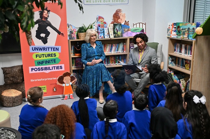 Britain's Queen Camilla (C) and pupils listen to WaterstonesChildren's Laureate and poet Joseph Coelho (R) reading a poem in the library of Moreland Primary School, in London, on May 7, 2024, as part of a visit to open a new Coronation Library, the 50th in a series of special primary school libraries that have been transformed over the last twelve months with the help of the National Literacy Trust, to mark the Coronation., Credit:JUSTIN TALLIS / Avalon