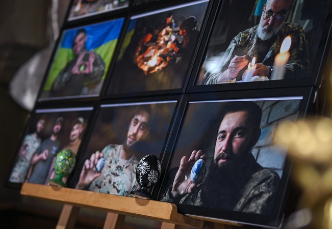 LVIV, UKRAINE - MAY 4, 2024 - Photographs and pysankas (Ukrainian Easter eggs) are displayed during the Pysanka From Bakhmut event aimed at raising money for the 80th Separate Galician Air Assault Brigade at Saint Peter and Paul Garrison Church, Lviv, western Ukraine., Credit:Anastasiia Smolienko / Avalon
