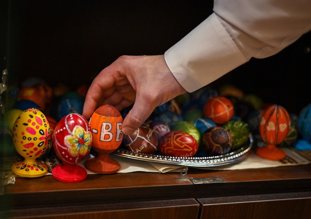 LVIV, UKRAINE - MAY 4, 2024 - Pysankas (Ukrainian Easter eggs) are displayed during the Pysanka From Bakhmut event aimed at raising money for the 80th Separate Galician Air Assault Brigade at Saint Peter and Paul Garrison Church, Lviv, western Ukraine., Credit:Anastasiia Smolienko / Avalon