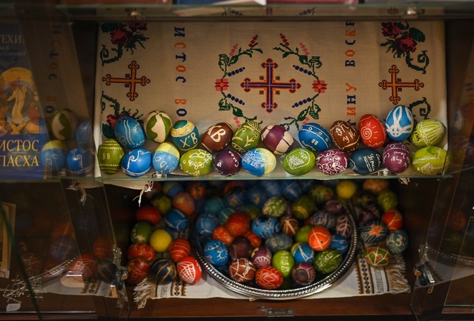 LVIV, UKRAINE - MAY 4, 2024 - Pysankas (Ukrainian Easter eggs) are displayed during the Pysanka From Bakhmut event aimed at raising money for the 80th Separate Galician Air Assault Brigade at Saint Peter and Paul Garrison Church, Lviv, western Ukraine., Credit:Anastasiia Smolienko / Avalon