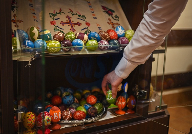 LVIV, UKRAINE - MAY 4, 2024 - Pysankas (Ukrainian Easter eggs) are displayed during the Pysanka From Bakhmut event aimed at raising money for the 80th Separate Galician Air Assault Brigade at Saint Peter and Paul Garrison Church, Lviv, western Ukraine., Credit:Anastasiia Smolienko / Avalon