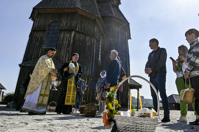 ZAPORIZHZHIA, UKRAINE - MAY 5, 2024 - Priests bless devotees and their baskets with holy water at the Church of the Intercession of the Theotokos which has hosted the first Easter service since the start of Russia's full-scale invasion at the Zaporizka Sich Historical and Cultural Complex on Khortytsia Island on Orthodox Easter, Zaporizhzhia, southeastern Ukraine., Credit:Dmytro Smolienko / Avalon