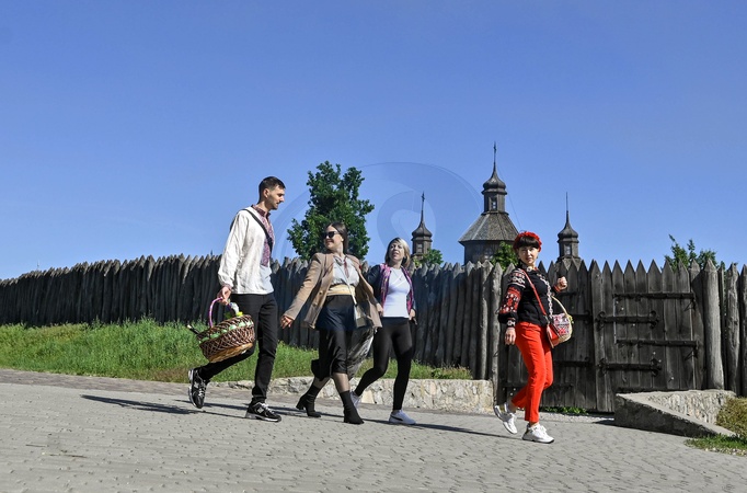 ZAPORIZHZHIA, UKRAINE - MAY 5, 2024 - People visit the Church of the Intercession of the Theotokos which has hosted the first Easter service since the start of Russia's full-scale invasion to bless their baskets at the Zaporizka Sich Historical and Cultural Complex on Khortytsia Island on Orthodox Easter, Zaporizhzhia, southeastern Ukraine., Credit:Dmytro Smolienko / Avalon
