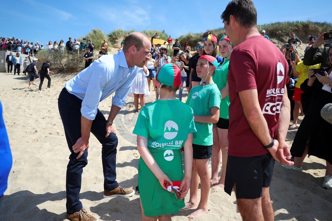 Britain's Prince William, the Duke of Cornwall, speaks with Hollywell Bay Surf Life Saving Club members, during a visit to Fistral Beach in Newquay, Britain, May 9, 2024., Credit:Toby Melville / Avalon