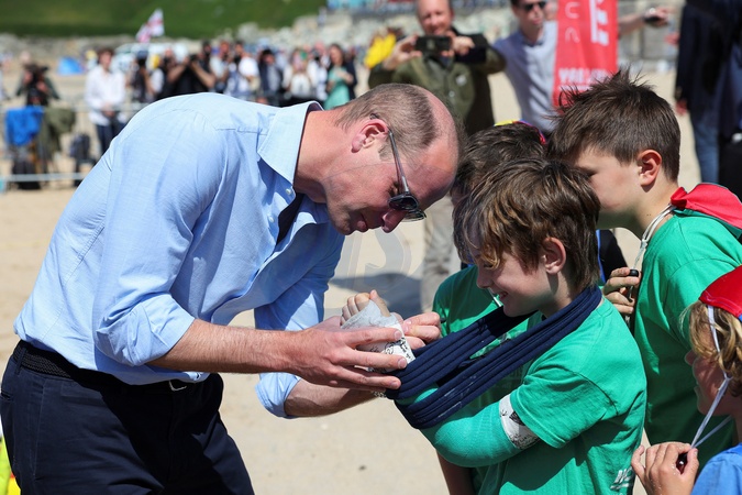 Britain's Prince William, the Duke of Cornwall, signs the cast of Felix Kanes, a member of Hollywell Bay Surf Life Saving Club, during a visit to Fistral Beach in Newquay, Britain, May 9, 2024., Credit:Toby Melville / Avalon