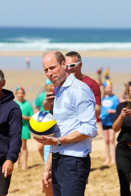 Britain's Prince William, the Duke of Cornwall holds a volleyball, as he visits Fistral Beach in Newquay, Britain, May 9, 2024., Credit:Toby Melville / Avalon