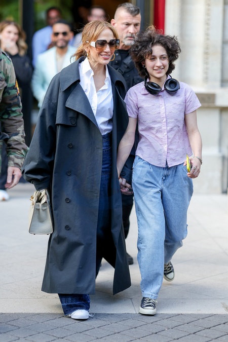 Jennifer Lopez et sa fille Emme à la sortie de l'hôtel La Réserve à Paris, France, le 8 mai 2024. Jennifer Lopez and her daughter Emme leaving the La Réserve hotel in Paris, France, on May 8, 2024.