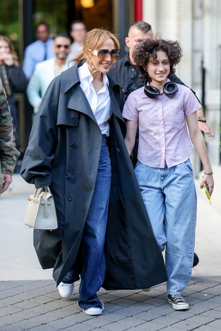 Jennifer Lopez et sa fille Emme à la sortie de l'hôtel La Réserve à Paris, France, le 8 mai 2024. Jennifer Lopez and her daughter Emme leaving the La Réserve hotel in Paris, France, on May 8, 2024.