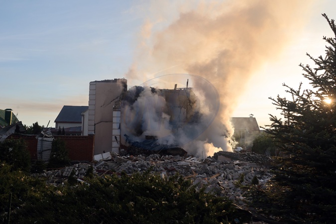 KHARKIV, UKRAINE - MAY 10, 2024 - Smoke rises over a house after a Russian missile attack, Kharkiv, northeastern Ukraine. On the night of 10 May, Russian invaders attacked Kharkiv with an S-300 missile. A child aged 11 and a 72-year-old woman were injured as a result of the attack on the private sector. Three houses were on fire, two of them were destroyed and one was damaged. In total, 26 buildings were destroyed, and more than 300 windows were smashed., Credit:Vyacheslav Madiyevskyy / Avalon