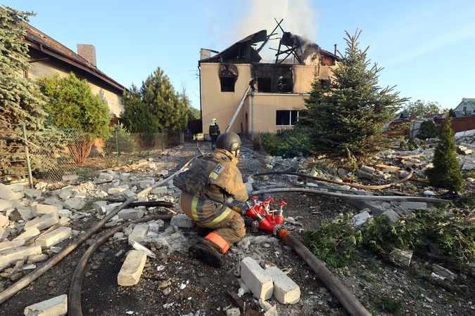 KHARKIV, UKRAINE - MAY 10, 2024 - Rescuers are seen at work at a house after a Russian missile attack, Kharkiv, northeastern Ukraine. On the night of 10 May, Russian invaders attacked Kharkiv with an S-300 missile. A child aged 11 and a 72-year-old woman were injured as a result of the attack on the private sector. Three houses were on fire, two of them were destroyed and one was damaged. In total, 26 buildings were destroyed, and more than 300 windows were smashed., Credit:Vyacheslav Madiyevskyy / Avalon