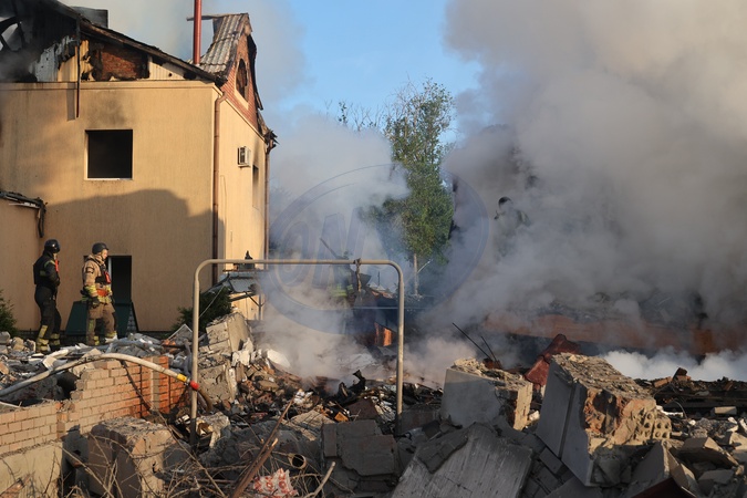 KHARKIV, UKRAINE - MAY 10, 2024 - Rescuers are seen at work at a house after a Russian missile attack, Kharkiv, northeastern Ukraine. On the night of 10 May, Russian invaders attacked Kharkiv with an S-300 missile. A child aged 11 and a 72-year-old woman were injured as a result of the attack on the private sector. Three houses were on fire, two of them were destroyed and one was damaged. In total, 26 buildings were destroyed, and more than 300 windows were smashed., Credit:Vyacheslav Madiyevskyy / Avalon