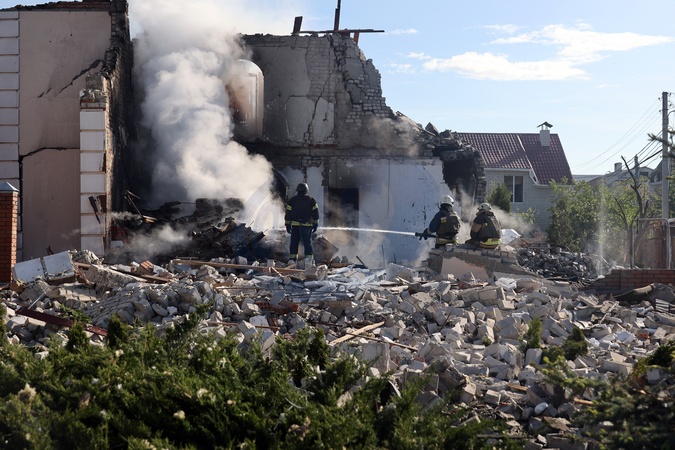 KHARKIV, UKRAINE - MAY 10, 2024 - Rescuers are seen at work at a house after a Russian missile attack, Kharkiv, northeastern Ukraine. On the night of 10 May, Russian invaders attacked Kharkiv with an S-300 missile. A child aged 11 and a 72-year-old woman were injured as a result of the attack on the private sector. Three houses were on fire, two of them were destroyed and one was damaged. In total, 26 buildings were destroyed, and more than 300 windows were smashed., Credit:Vyacheslav Madiyevskyy / Avalon