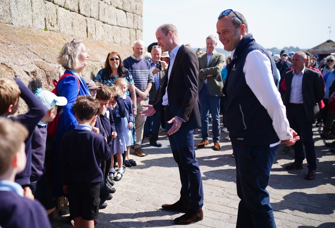 The Prince of Wales, known as the Duke of Cornwall when in Cornwall, speaks to school children during a visit to St. Mary's Harbour, the maritime gateway to the Isles of Scilly, to meet representatives from local businesses operating in the area. Picture date: Friday May 10, 2024. NO UK USE FOR 48 HOURS, Credit:Avalon.red / Avalon