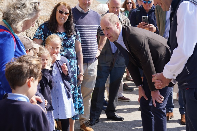 The Prince of Wales, known as the Duke of Cornwall when in Cornwall, speaks to school children during a visit to St. Mary's Harbour, the maritime gateway to the Isles of Scilly, to meet representatives from local businesses operating in the area. Picture date: Friday May 10, 2024. NO UK USE FOR 48 HOURS, Credit:Avalon.red / Avalon