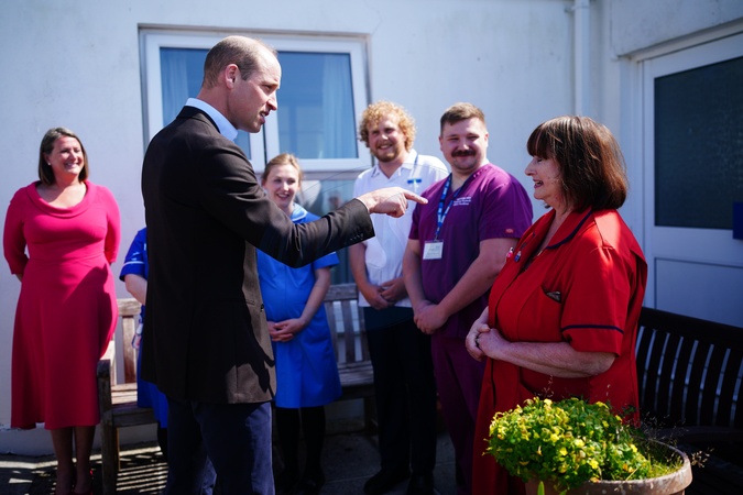 The Prince of Wales, known as the Duke of Cornwall when in Cornwall, speaking to Lynda McHale during a visit to St. Mary's Community Hospital, Isles of Scilly, to meet staff and hear about a new integrated health and social care facility which is set to be built on adjacent land owned by the Duchy of Cornwall. Picture date: Friday May 10, 2024. NO UK USE FOR 48 HOURS, Credit:Avalon.red / Avalon