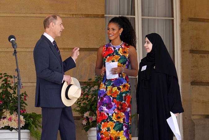 The Duke of Edinburgh speaks to Vick Hope and Ifrah Shaft, winner of the Duke of Edinburgh's Gold Award, during the Duke of Edinburgh's Gold Award presentations in the garden of Buckingham Palace, London. Picture date: Friday May 10, 2024. NO UK USE FOR 48 HOURS, Credit:Avalon.red / Avalon