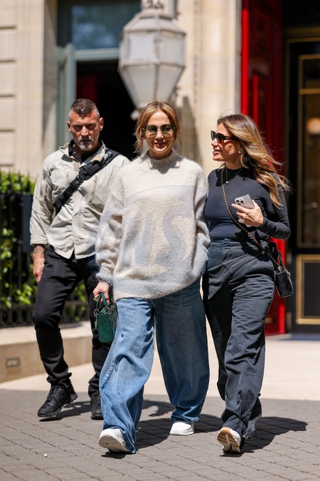 Jennifer Lopez sort et revient à l'hôtel La Réserve après avoir fait un saut dans une pharmacie à Paris, France, le 10 mai 2024. JLo est habillée de façon décontractée avec son jean baggy, un pull blanc et des baskets blanches associés à un sac à main vert. Jennifer Lopez steps out and returns to La Réserve Hotel after popping into a pharmacy in Paris, France on May 10, 2024. JLo is dressed casually in her baggy jeans, a white sweater and white sneakers paired with a green handbag.