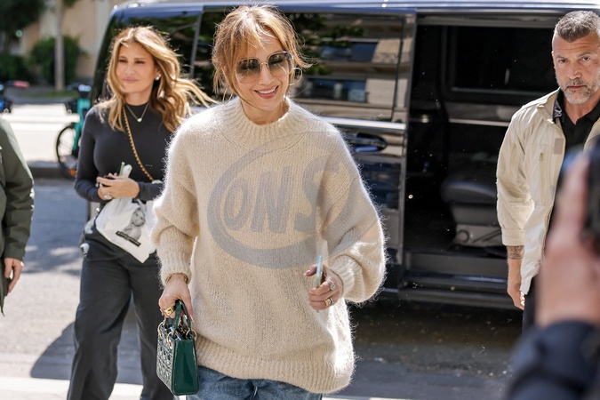 Jennifer Lopez sort et revient à l'hôtel La Réserve après avoir fait un saut dans une pharmacie à Paris, France, le 10 mai 2024. JLo est habillée de façon décontractée avec son jean baggy, un pull blanc et des baskets blanches associés à un sac à main vert. Jennifer Lopez steps out and returns to La Réserve Hotel after popping into a pharmacy in Paris, France on May 10, 2024. JLo is dressed casually in her baggy jeans, a white sweater and white sneakers paired with a green handbag.