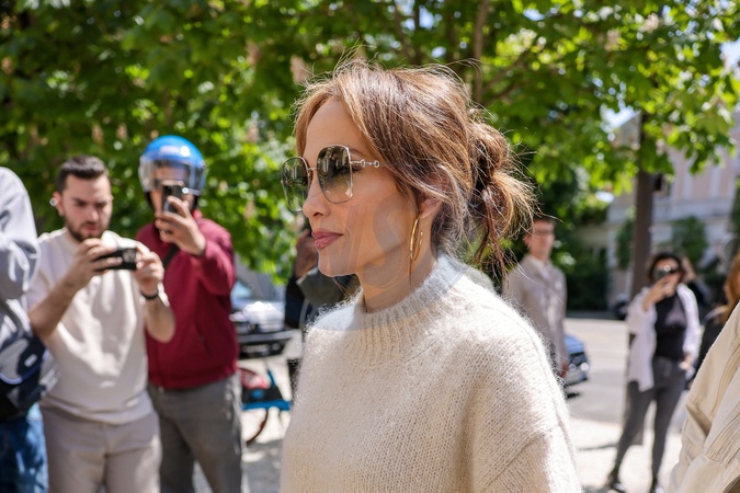 Jennifer Lopez sort et revient à l'hôtel La Réserve après avoir fait un saut dans une pharmacie à Paris, France, le 10 mai 2024. JLo est habillée de façon décontractée avec son jean baggy, un pull blanc et des baskets blanches associés à un sac à main vert. Jennifer Lopez steps out and returns to La Réserve Hotel after popping into a pharmacy in Paris, France on May 10, 2024. JLo is dressed casually in her baggy jeans, a white sweater and white sneakers paired with a green handbag.