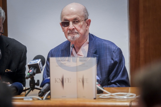 Salman Rushdie at a press conference at the Salone Internazionale del Libro di Torino., Credit:Giulio Lapone / Avalon