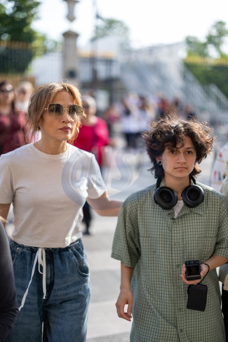 Exclusif - Jennifer Lopez sort de l'hôtel La Réserve pour aller dans un magasin de miroir renommé avant de profite des jardins parisiens avec Loren Ridinger, Benny Medina et sa fille, Emme à Paris, France, le 10 mai 2024. Exclusive - Jennifer Lopez leaves the La Réserve hotel to go to a renowned mirror store before enjoying the Parisian gardens with Loren Ridinger, Benny Medina and her daughter, Emme in Paris, France, on May 10, 2024.