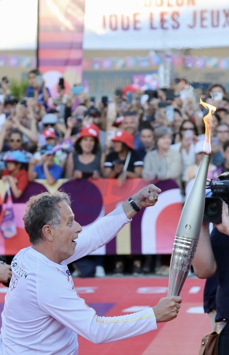 Charles Berling, ostatni niosący znicz olimpijski na Igrzyska Olimpijskie w Paryżu w 2024 r. w Var, zapala kocioł w Tulonie