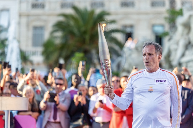 Charles Berling, ostatni niosący znicz olimpijski na Igrzyska Olimpijskie w Paryżu w 2024 r. w Var, zapala kocioł w Tulonie