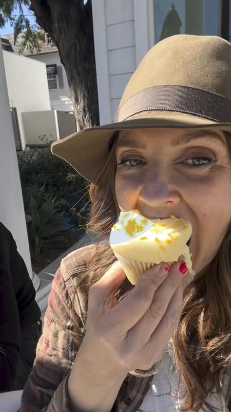 Screenshot of Drew Barrymore, latest post on social media, 10th May 2024.Quote:"How lucky am I to be sitting on a curb eating cupcakes with you! @lonavigi", Credit:B4859 / Avalon