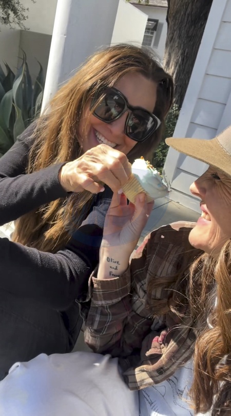 Screenshot of Drew Barrymore, latest post on social media, 10th May 2024.Quote:"How lucky am I to be sitting on a curb eating cupcakes with you! @lonavigi", Credit:B4859 / Avalon
