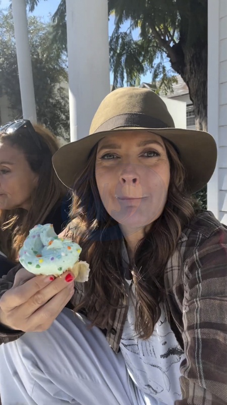 Screenshot of Drew Barrymore, latest post on social media, 10th May 2024.Quote:"How lucky am I to be sitting on a curb eating cupcakes with you! @lonavigi", Credit:B4859 / Avalon