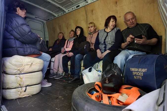 KHARKIV REGION, UKRAINE - MAY 10, 2024 - Residents of the Vovchansk district which is under constant shelling by Russian troops sit in the van during the evacuation, Kharkiv region, northeastern Ukraine., Credit:Vyacheslav Madiyevskyy / Avalon