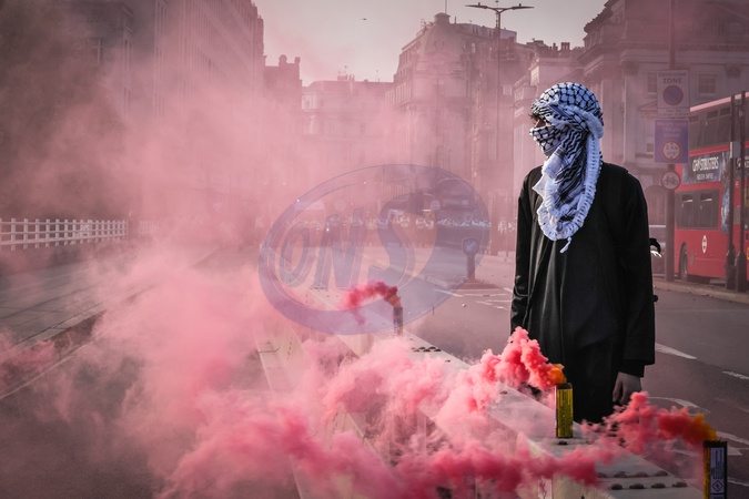 Westminster, London, UK, 11th May 2024. A protester in Palestinian scarve stands alone on one side of the bridge, with a red flare. The 'Emergency Protest for Palestine', a collaboration between Youth Demand, Health Workers for Palestine and several other organisations, has blocked Waterloo Bridge in London. Smoke flares and angry protesters can be seen. The protest had set off from near the London Eye via the Southbank to reach ist destination at the Bridge., Credit:Imageplotter / Avalon