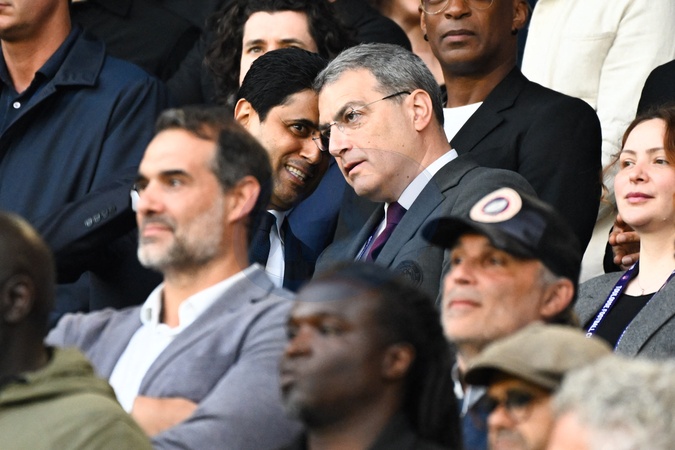 Nasser Al Khelaifi ( president PSG ) talks with Damien Comolli ( president Toulouse ) during the Ligue 1 match between Paris Saint Germain and Toulouse FC at Parc Des Princes on May 12, 2024 in Paris, France.