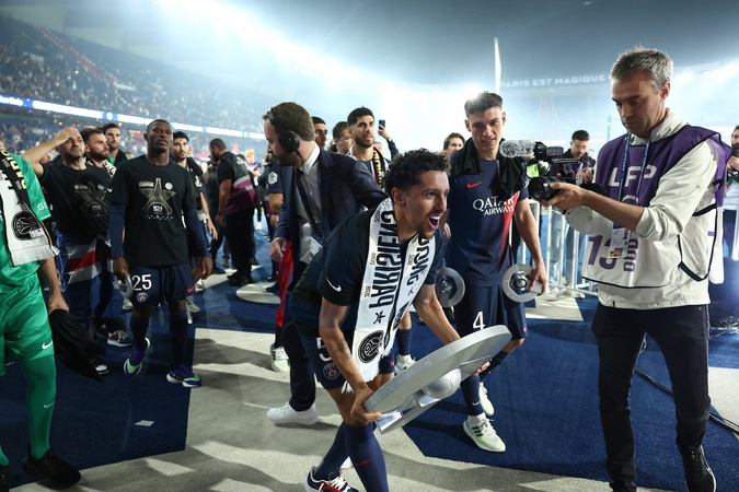 Marquinhos - Dernier match de Kylian Mbappé (25 ans) avec le PSG en Ligue 1 Uber Eats lors de la rencontre "PSG-Toulouse" (1-3) au Parc des Princes à Paris le 12 mai 2024. © Franck Fife / Pool /Bestimage Last match of Kylian Mbappé (25 years old) with PSG in Ligue 1 Uber Eats during the "PSG-Toulouse" meeting (1-3) at the Parc des Princes in Paris on May 12, 2024