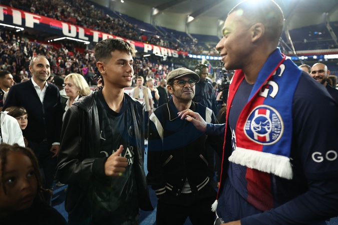 Jamel Debbouze avec son fils Léon, Kylian Mbappé - Dernier match de Kylian Mbappé (25 ans) avec le PSG en Ligue 1 Uber Eats lors de la rencontre "PSG-Toulouse" (1-3) au Parc des Princes à Paris le 12 mai 2024. © Franck Fife / Pool /Bestimage Last match of Kylian Mbappé (25 years old) with PSG in Ligue 1 Uber Eats during the "PSG-Toulouse" meeting (1-3) at the Parc des Princes in Paris on May 12, 2024