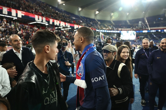 Jamel Debbouze avec son fils Léon, Kylian Mbappé - Dernier match de Kylian Mbappé (25 ans) avec le PSG en Ligue 1 Uber Eats lors de la rencontre "PSG-Toulouse" (1-3) au Parc des Princes à Paris le 12 mai 2024. © Franck Fife / Pool /Bestimage Last match of Kylian Mbappé (25 years old) with PSG in Ligue 1 Uber Eats during the "PSG-Toulouse" meeting (1-3) at the Parc des Princes in Paris on May 12, 2024