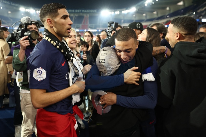 Achraf Hakimi avec sa mère et Kylian Mbappé - Dernier match de Kylian Mbappé (25 ans) avec le PSG en Ligue 1 Uber Eats lors de la rencontre "PSG-Toulouse" (1-3) au Parc des Princes à Paris le 12 mai 2024. © Franck Fife / Pool /Bestimage Last match of Kylian Mbappé (25 years old) with PSG in Ligue 1 Uber Eats during the "PSG-Toulouse" meeting (1-3) at the Parc des Princes in Paris on May 12, 2024