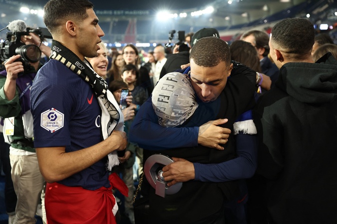 Achraf Hakimi avec sa mère et Kylian Mbappé - Dernier match de Kylian Mbappé (25 ans) avec le PSG en Ligue 1 Uber Eats lors de la rencontre "PSG-Toulouse" (1-3) au Parc des Princes à Paris le 12 mai 2024. © Franck Fife / Pool /Bestimage Last match of Kylian Mbappé (25 years old) with PSG in Ligue 1 Uber Eats during the "PSG-Toulouse" meeting (1-3) at the Parc des Princes in Paris on May 12, 2024