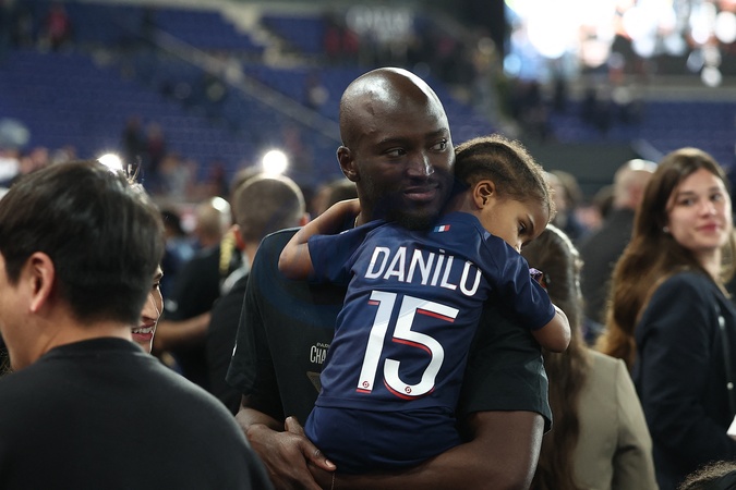Danilo Pereira et sa fille - Dernier match de Kylian Mbappé (25 ans) avec le PSG en Ligue 1 Uber Eats lors de la rencontre "PSG-Toulouse" (1-3) au Parc des Princes à Paris le 12 mai 2024. © Franck Fife / Pool /Bestimage Last match of Kylian Mbappé (25 years old) with PSG in Ligue 1 Uber Eats during the "PSG-Toulouse" meeting (1-3) at the Parc des Princes in Paris on May 12, 2024