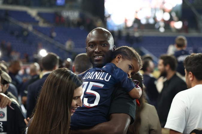 Danilo Pereira et sa fille - Dernier match de Kylian Mbappé (25 ans) avec le PSG en Ligue 1 Uber Eats lors de la rencontre "PSG-Toulouse" (1-3) au Parc des Princes à Paris le 12 mai 2024. © Franck Fife / Pool /Bestimage Last match of Kylian Mbappé (25 years old) with PSG in Ligue 1 Uber Eats during the "PSG-Toulouse" meeting (1-3) at the Parc des Princes in Paris on May 12, 2024