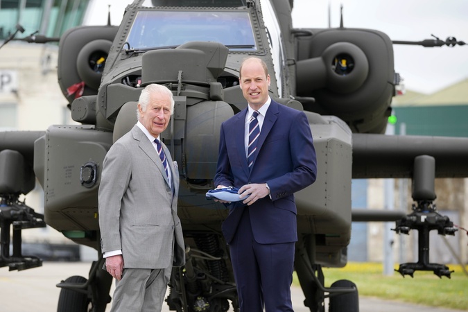 Britain's King Charles III officially hands over the role of Colonel-in-Chief of the Army Air Corps to Prince William, The Prince of Wales in front of an Apache helicopter at the Army Aviation Centre in Middle Wallop, England, Monday, May 13, 2024., Credit:Kin Cheung / Avalon
