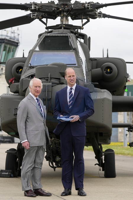 Britain's King Charles III officially hands over the role of Colonel-in-Chief of the Army Air Corps to Prince William, The Prince of Wales in front of an Apache helicopter at the Army Aviation Centre in Middle Wallop, England, Monday, May 13, 2024., Credit:Kin Cheung / Avalon