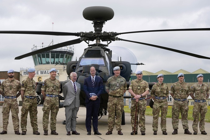 Britain's King Charles III poses with service personal after he officially handed over the role of Colonel-in-Chief of the Army Air Corps to Prince William, The Prince of Wales in front of an Apache helicopter at the Army Aviation Centre in Middle Wallop, England, Monday, May 13, 2024., Credit:Kin Cheung / Avalon