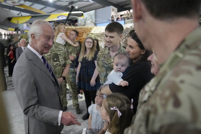 Britain's King Charles III meets staff members and their families at the Army Aviation Centre in Middle Wallop, England, Monday, May 13, 2024. King Charles III will officially hand over the role of Colonel-in-Chief of the Army Air Corps to Prince William, The Prince of Wales., Credit:Kin Cheung / Avalon