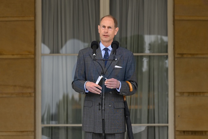 LONDON, ENGLAND - MAY 13: Prince Edward, Duke of Edinburgh addresses guests as Gold Award recipients of the Duke of Edinburgh award attend a garden party at Buckingham Palace on May 13, 2024 in London, England. Established by Prince Philip in 1956, the Duke of Edinburgh's Award (DofE) was created to inspire millions of young individuals worldwide to cultivate skills, resilience, and self-confidence. Now under the stewardship of Prince Edward, Duke of Edinburgh, the national program continues to support the development of young people, that individuals aged 14-24 have equal opportunities to explore new interests and give back to their communities., Credit:Leon Neal / Avalon