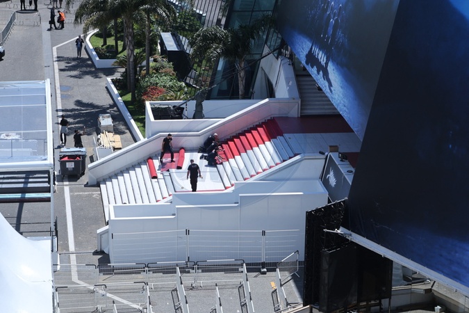 Rozkładanie czerwonego dywanu przed pałacem, dzień przed otwarciem 77. Międzynarodowego Festiwalu Filmowego w Cannes