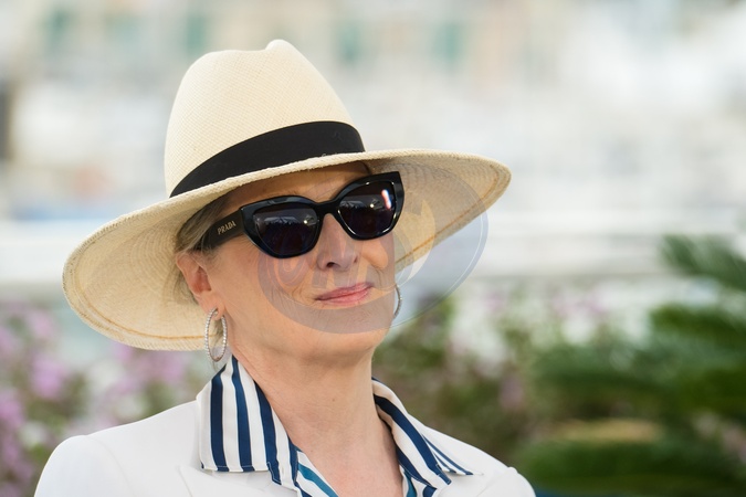 Meryl Streep poses at the Photocall for the Palme D'or D'honneur - Meryl Streep during the 77th Festival de Cannes on Tuesday 14 May 2024 at Le Palais des festivals, Cannes. Meryl wore a straw hat over a white suit with silver high heeled shoes ., Credit:Julie Edwards / Avalon