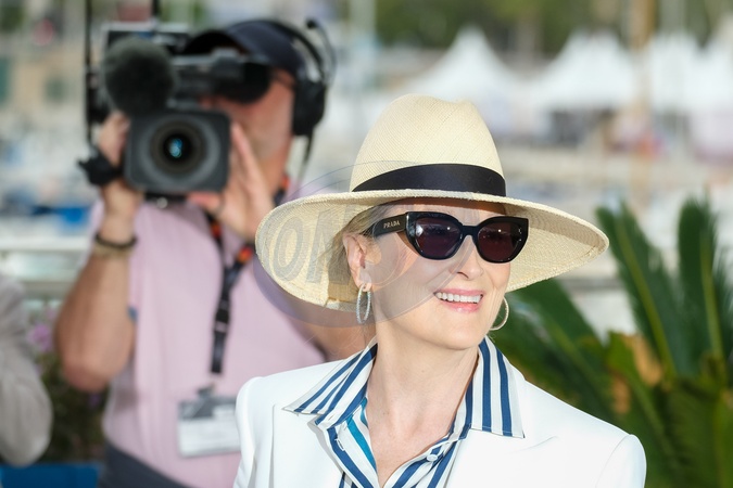 Meryl Streep poses at the Photocall for the Palme D'or D'honneur - Meryl Streep during the 77th Festival de Cannes on Tuesday 14 May 2024 at Le Palais des festivals, Cannes. Meryl wore a straw hat over a white suit with silver high heeled shoes ., Credit:Julie Edwards / Avalon
