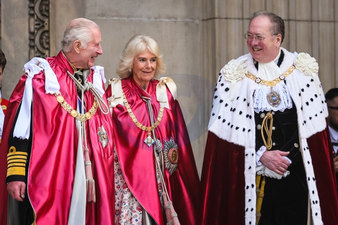 London, UK, 15th May 2024. The King and Queen, together with the Lord Mayor, exit St Paul's Cathedral after the service. Their Majesties King Charles III and Queen Camilla attend a Service of Dedication for the Order of the British Empire at St Paul's Cathedral in London today. The ceremonial service is attended by holders of the Orders awards, as well as many others., Credit:Imageplotter / Avalon