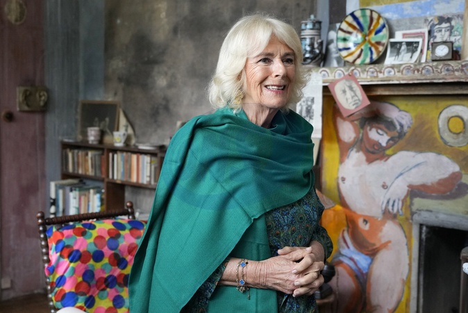 Britain's Queen Camilla views the studio at Charleston House after a surprise appearance at the opening session of the Charleston Festival in Charleston, England, Thursday, May 16, 2024. The Queen joins this year's opening event called the 'Power of Read